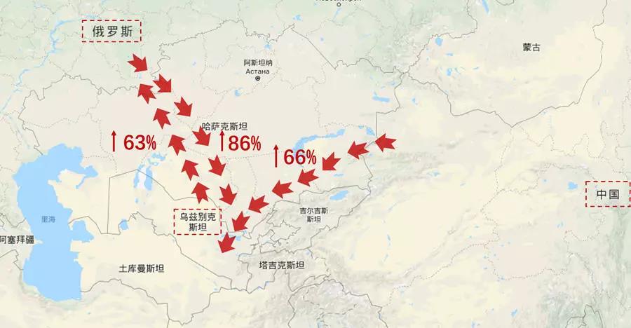 據(jù)介紹,這種大幅增長主要表現(xiàn)在南向與哈薩克斯坦接壤的烏茲別克斯坦的進(jìn)出境上。中國→烏茲別克斯坦之間的交通運(yùn)輸量增長了66%,而俄羅斯→烏茲別克斯坦的交通運(yùn)輸量增長了86%,烏茲別克斯坦→俄羅斯的運(yùn)輸量增長了63%。(見下圖)