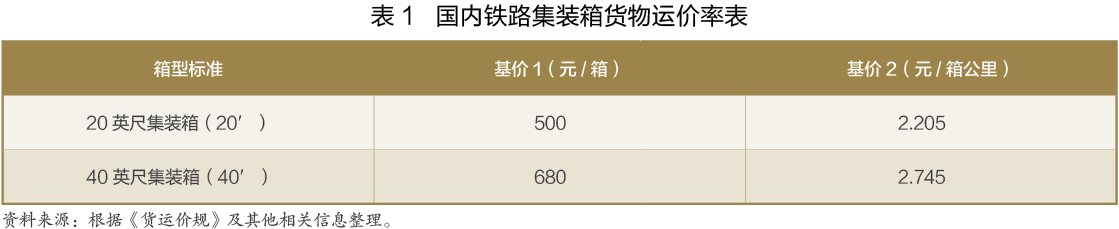 根據《中華人民共和國鐵道部鐵路貨物運價規(guī)則(鐵運[2005]46號)》(以下簡稱“貨運價規(guī)”)以及國家發(fā)展改革委發(fā)布的關于調整鐵路貨物運價價格的相關通知文件(《國家發(fā)展改革委關于調整鐵路貨運價格進一步完善價格形成機制的通知》發(fā)改價格〔2015〕183號),國際鐵路聯(lián)運的國內段集裝箱貨物運輸?shù)摹盎鶅r1”(也稱發(fā)到基價)為500元/TEU(20英尺箱)和680元/FEU(40英尺箱),“基價2”(也稱運行基價)為2.205元/TEU*公里和2.754元/FEU*公里(見表1)。集裝箱貨物每箱運費的計算方法為基價1+基價2×運價公里。此外,按照鐵路相關規(guī)定,國際鐵路聯(lián)運的國內段運輸,還需要繳納電氣化附加費、新路新價均攤費、鐵路建設基金等費用,由于項目較多且近年來有所調整,在此不再贅述。值得一提的是,2016年11月,國家發(fā)展改革委發(fā)布《關于清理規(guī)范涉及鐵路貨物運輸有關收費的通知》(發(fā)改價格〔2016〕2498號),要求相關收費主體限期清理規(guī)范鐵路貨物運輸過程中除鐵路運價之外的各種收費,其中涉及鐵路運輸企業(yè)的收費包括鐵路貨物運輸雜費、向專用線產權或經營單位收取的專用線代維修代維護等費用。