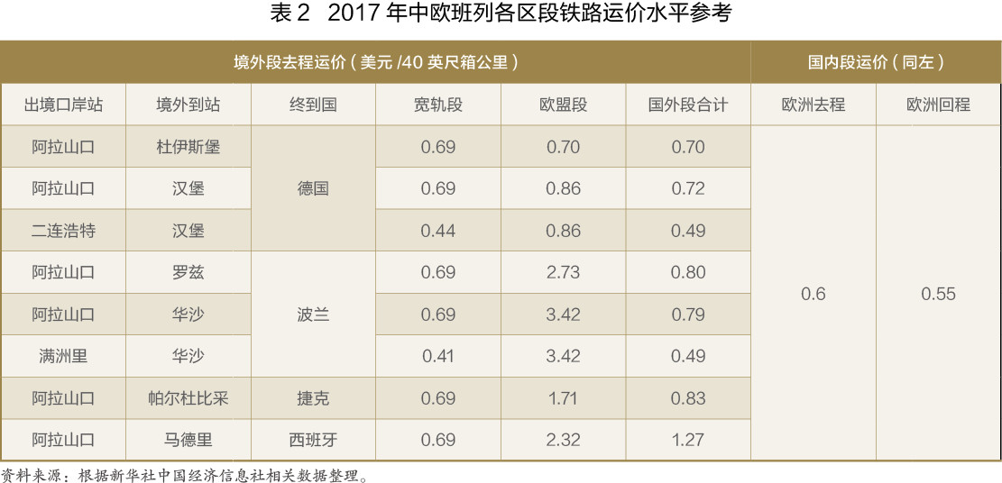 根據2017年各班列運行線路公布的運價水平,寬軌段的去程平均運價水平大多為0.69美元/大箱公里,經二連浩特和滿洲里出境利用西伯利亞大陸橋的運價較低,約為0.4美元/大箱公里;歐盟段的去程平均運價水平差異較大,根據不同線路走向,從0.7美元/大箱公里至3.42美元/大箱公里不等,高運價率的區(qū)段一般是由于運輸里程較短,固定費用分攤較多所致。國內段的去程平均運價水平約在0.6美元/大箱公里,回程平均運價水平約在0.55美元/大箱公里(見表2)。