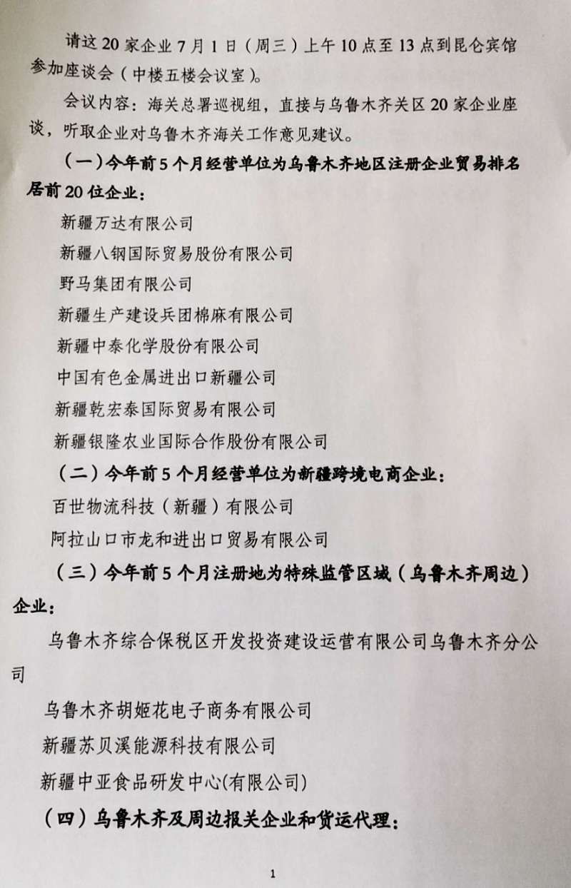 2020年7月1日上午10點-13點,假新疆昆侖賓館中樓五樓會議室,海關(guān)總署黨委第九巡視組召開了巡視烏魯木齊海關(guān)后的第一次關(guān)企座談會。今年前五個月經(jīng)營單位為烏魯木齊地區(qū)注冊且企業(yè)貿(mào)易排名居前20位之內(nèi)的企業(yè)、今年前五個月經(jīng)營單位為新疆的跨境電商企業(yè)、今年前五個月注冊地為特殊監(jiān)管區(qū)域(烏魯木齊周邊)的企業(yè)、烏魯木齊周邊保管企業(yè)和貨運代理企業(yè),共二十家單位均派出代表參會。會上,各位代表就今年疫情影響及應(yīng)對措施、面臨世界經(jīng)貿(mào)形勢持續(xù)走低壓力下的新疆企業(yè)如何走出困境、為促進(jìn)企業(yè)發(fā)展、關(guān)企寫作與互動等方面積極踴躍發(fā)言,提出了很多好的建議與意見?偸鹧惨暯M成員將上述給位代表提出的中肯意見和建議一一記錄在案,表示將協(xié)調(diào)烏魯木齊海關(guān)進(jìn)行充分溝通積極解決。